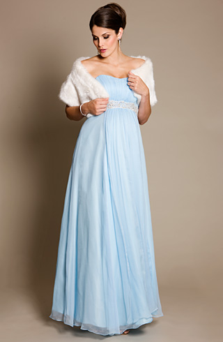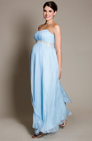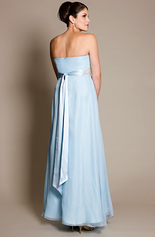 This maternity dress includes a sparkling diamante sash with elegant powder blue silk ties, perfect for a fairytale wedding.